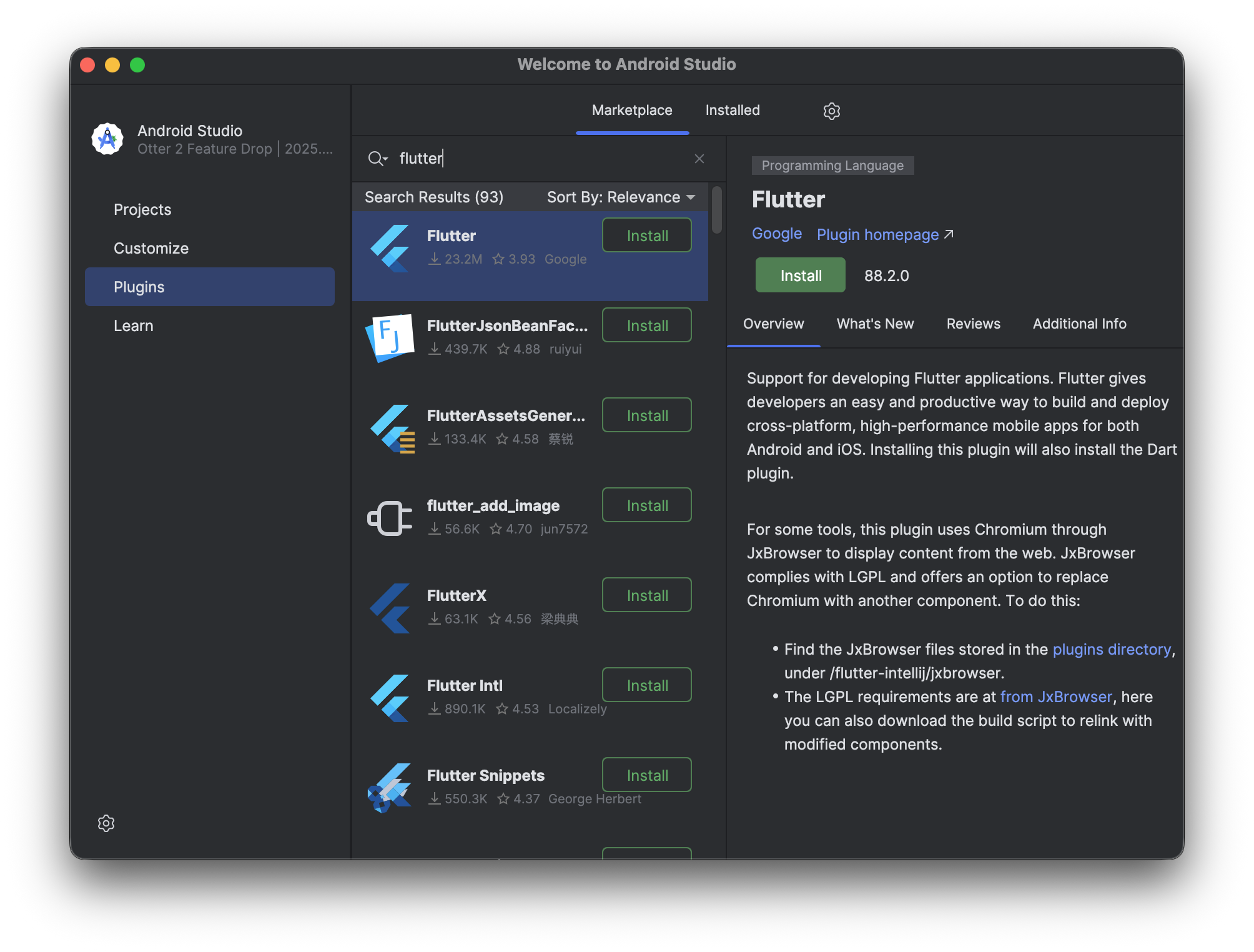 တကယ်လို့ Android Studio အသုံးပြုမယ်ဆိုရင်တော့ အပေါ်မှာ ပေးထားတဲ့ link ကနေ Android Studio ကို download ဆွဲပြီး install လိုက်လို့ ရပါတယ်။ Android Studio setup လုပ်ပြီးသွားရင်တော့ Flutter အတွက် လိုအပ်မယ့် Plugin သွင်းဖို့ လိုပါမယ်။ Android Studio မှာ Plugins tab ကိုဖွင့်ပြီး Flutter ဆိုတဲ့ Plugin ကို Marketplace မှာ ရှာပြီး Install လုပ်ပေးလိုက်ပါ။