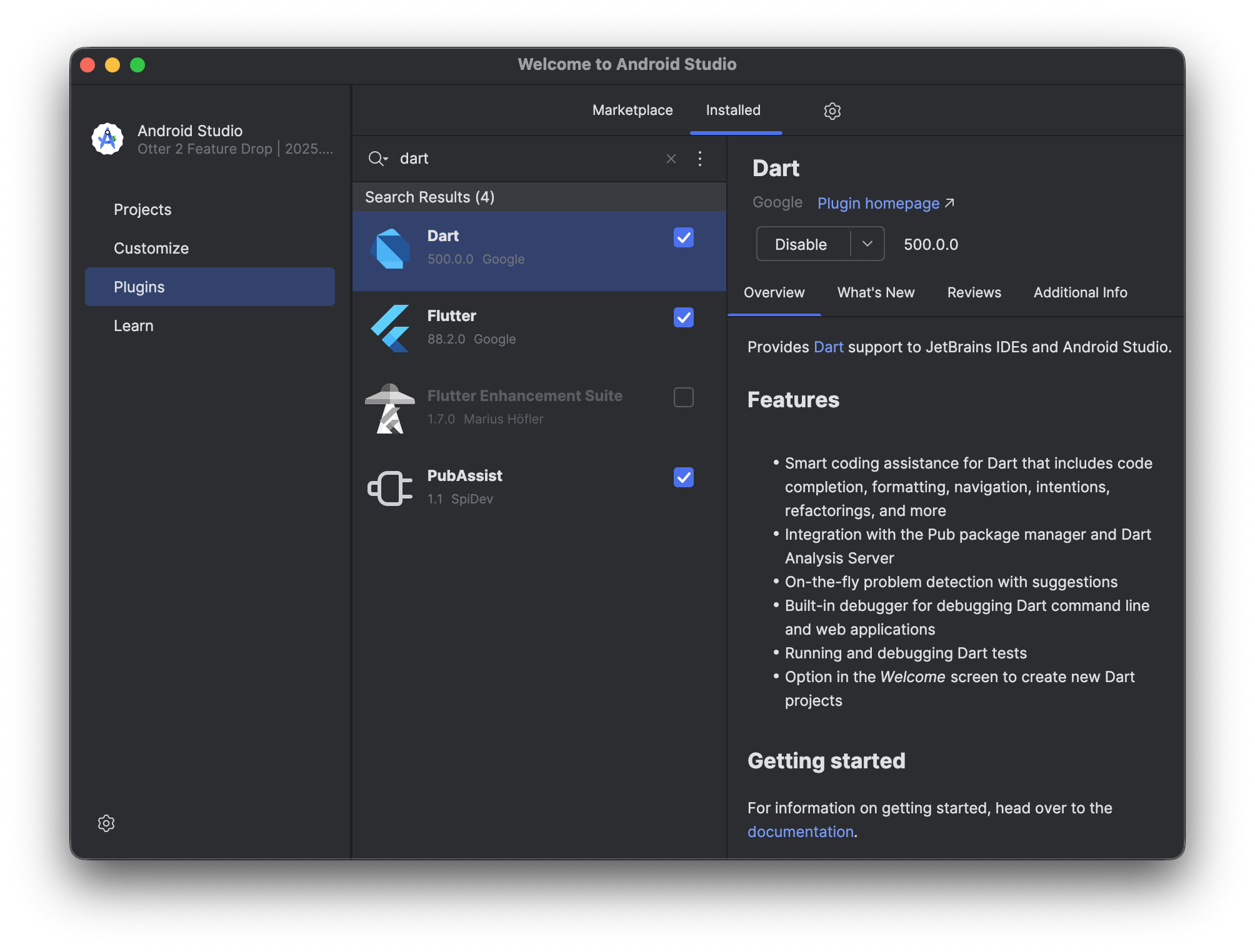Flutter Plugin ကို install လုပ်လိုက်တာနဲ့ Dart ဆိုတဲ့ Plugin ကိုပါ တခါထဲ install လုပ်သွားပါလိမ့်မယ်။