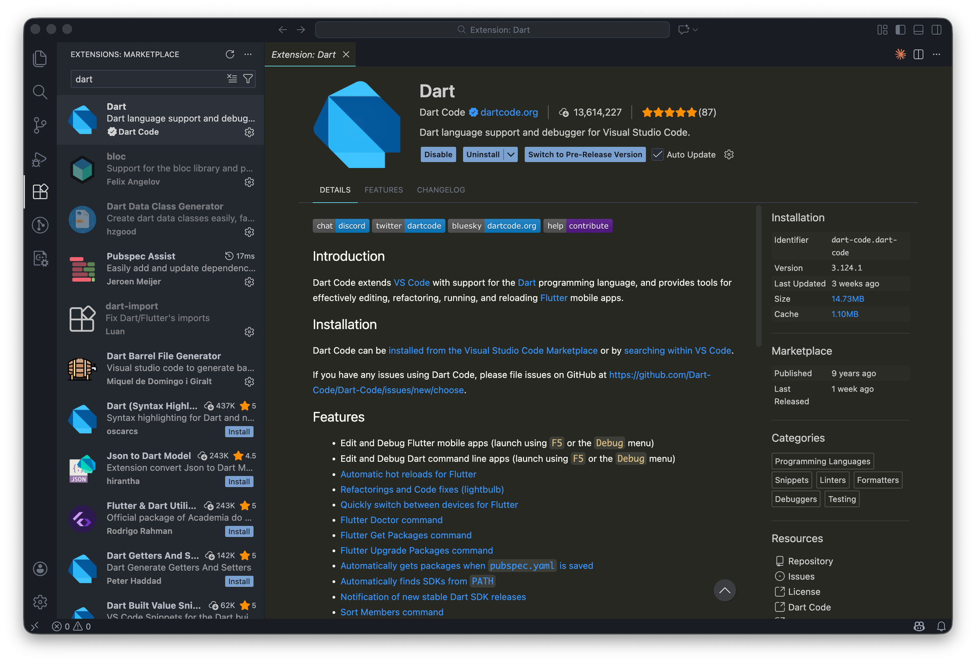 တကယ်လို့ ကိုယ်က VS Code သုံးမယ်ဆိုရင်တော့ VS Code မှာ extension တချို့ သွင်းထားဖို့ လိုအပ်ပါမယ်။ VS Code ရဲ့ extension tab ကို ဖွင့်ပြီးတော့ Flutter ဆိုပြီး ရိုက်ရှာလိုက်ရင် Flutter extension ထွက်လာပါလိမ့်မယ်။ Install လုပ်လိုက်ပါ။
