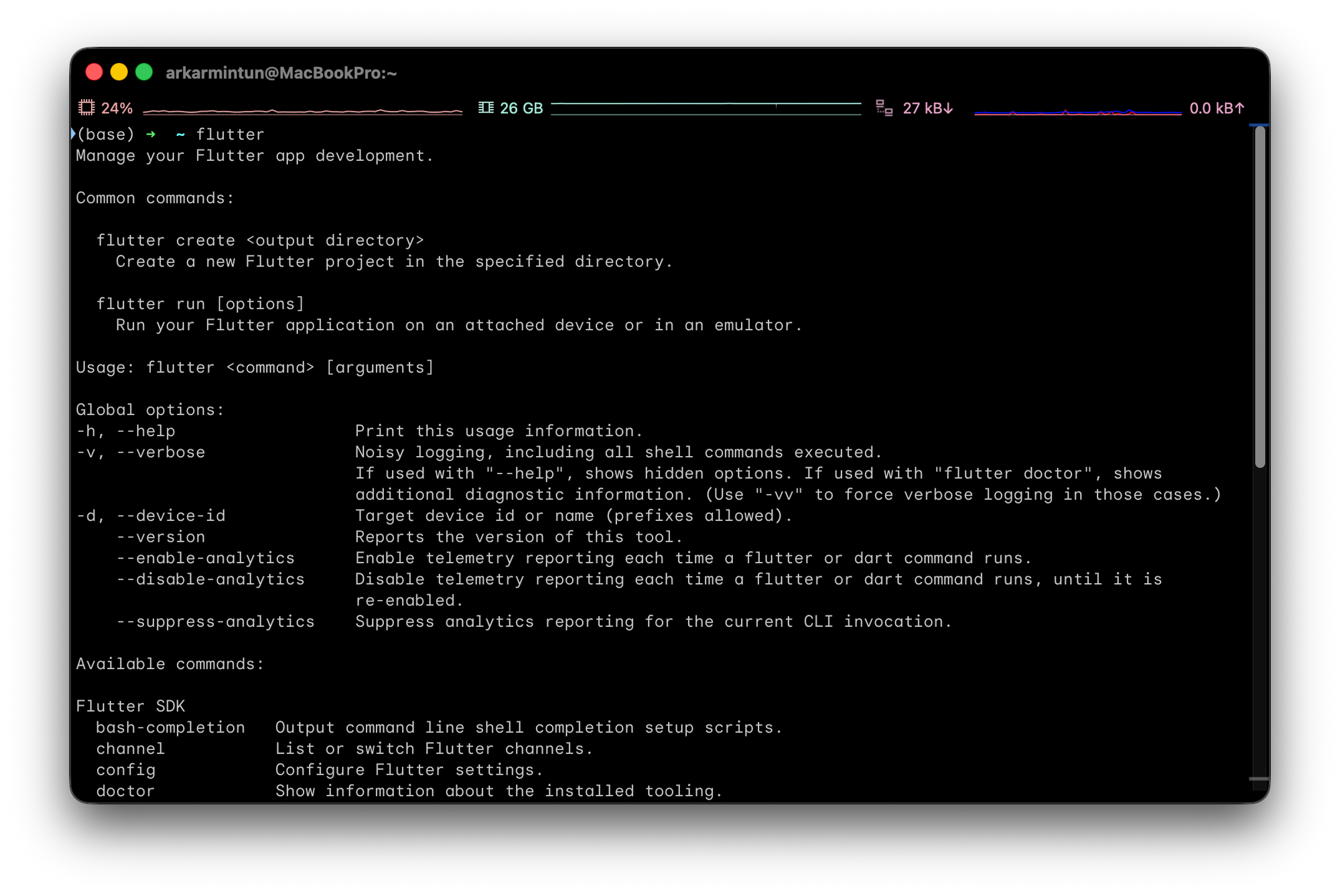 အခုလိုမျိုး flutter နဲ့ပတ်သက်တဲ့ command တွေပြပေးနေပြီဆိုရင်တော့ flutter installation အောင်မြင်စွာ ပြီးဆုံးပါပြီ။ 🎉