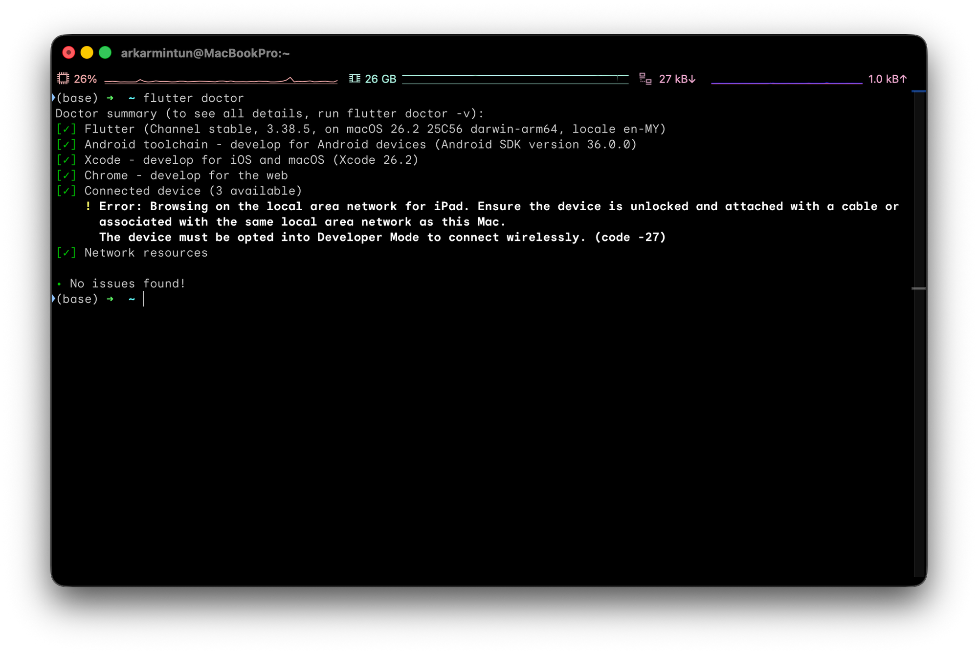 Install လုပ်ပြီးပြီဆိုရင်တော့ လိုအပ်တဲ့ configuration ပိုင်းလေးကို ဆက်ကြည့်လိုက်ရအောင်ပါ။ terminal မှာပဲ flutter doctor ဆိုပြီး run ကြည့်လိုက်ပါ။