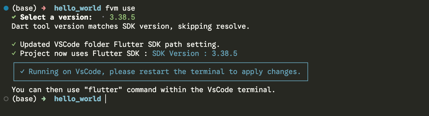 fvm use ဆိုတာကို run လိုက်တာနဲ့ လက်ရှိ project မှာ သတ်မှတ်ထားတဲ့ flutter version ကို အလွယ်တကူပဲ ပြောင်းပေးနိုင်ပါတယ်။ Installation ပိုင်းမှာ ကိုယ်နဲ့အဆင်ပြေတဲ့နည်းလမ်းနဲ့ Flutter SDK ကို install လုပ်လို့ရပါတယ်။ Installation ပိုင်းအဆင်ပြေမပြေဆိုတာ စစ်ဖို့ terminal မှာ flutter ဆိုပြီး run ကြည့်လိုက်ပါ။