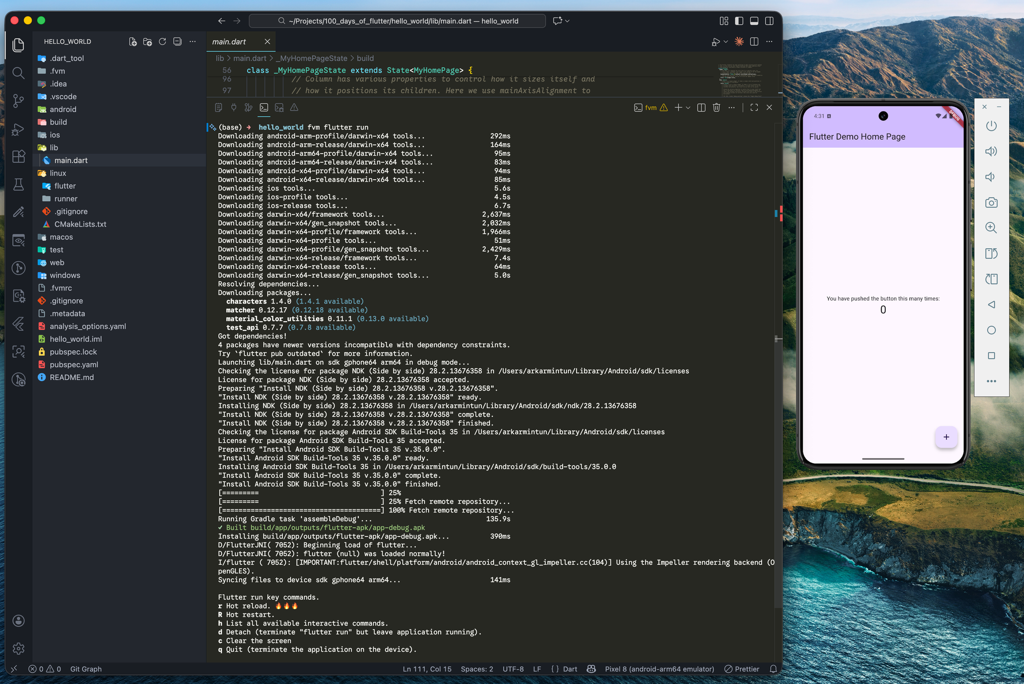 ပြီးရင်တော့ vscode ထဲပြန်လာပြီးတော့ flutter run ဆိုပြီး ရိုက်ထည့်လိုက်ပါမယ်။ ကျွန်တော်က fvm ကို သုံးထားတာဖြစ်လို့ fvm flutter run ဆိုပြီး run လိုက်ပါမယ်။ အခုလိုမျိုး မြင်ရပြီး counter app တက်လာပြီဆိုရင်တော့ ဒီအဆင့်ပြီးဆုံးပြီပဲ ဖြစ်ပါတယ်။ app ရဲ့ အောက်ဒေါင့်နားမှာ ပြထားတဲ့ + button ကိုနှိပ်လိုက်မယ်ဆိုရင် count value တက်လာမှာပဲ ဖြစ်ပါတယ်။