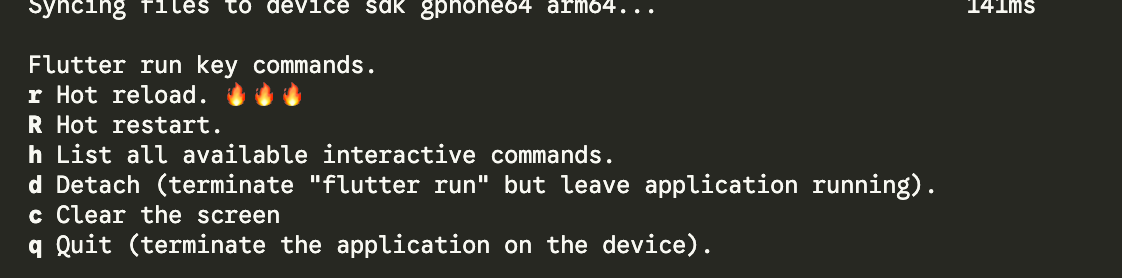 flutter run နေတဲ့ terminal ရဲ့ အောက်နားကို ကြည့်မယ်ဆို အခုလိုမျိုး မြင်ရမှာပဲ ဖြစ်ပါတယ်။