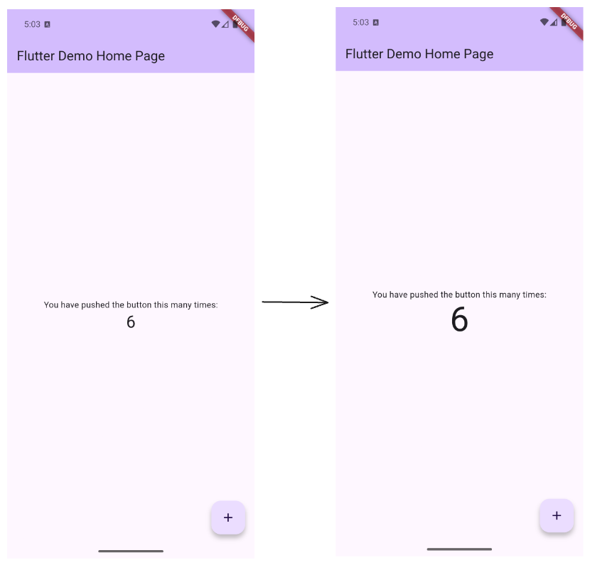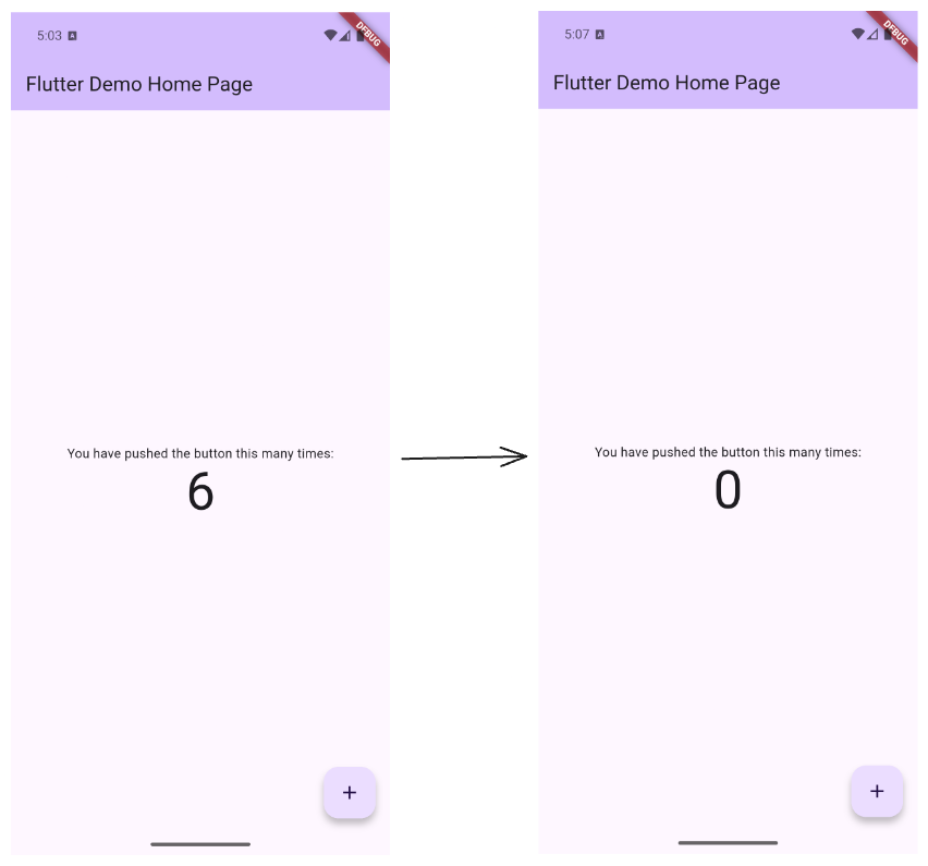 ဒီနေရာမှာ လက်ရှိ value 6 ဆိုတာကတော့ state အနေနဲ့ ရှိနေတဲ့ value ပဲ ဖြစ်ပါတယ်။ တကယ်လို့ hot restart လုပ်လိုက်တယ်ဆိုရင်တော့ value တွေပါ reset ဖြစ်သွားမှာ ဖြစ်ပါတယ်။ app တခုလုံး အစကနေ ပြန် run လိုက်တဲ့သဘောပဲ ဖြစ်ပါတယ်။ app တခုလုံးကို ရပ်ပြီး ပြန် run တာလောက်မကြာတော့ဘဲ app တခုလုံး restart လုပ်လိုက်တာပဲ ဖြစ်ပါတယ်။