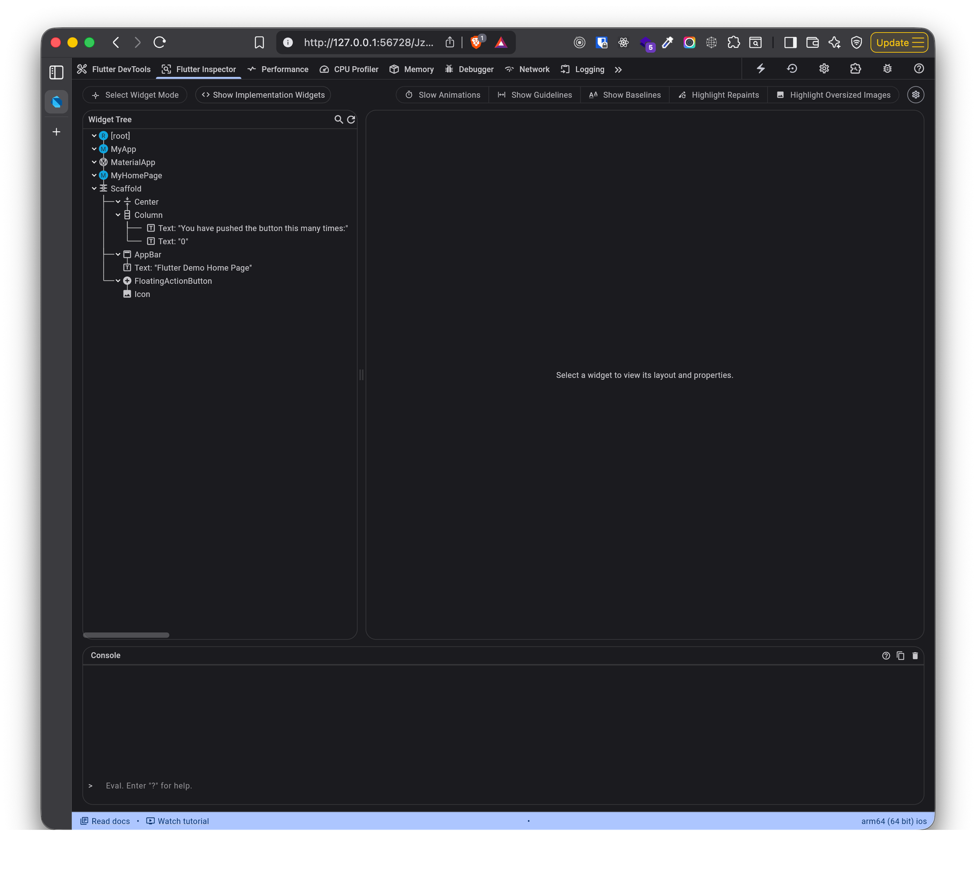 ဒီမှာမြင်နေရတဲ့ "A Dart VM Service on ..." ဆိုပြီးပြထားတဲ့ link ကို browser မှာ ဖွင့်လိုက်ရင် Flutter Dev Tools ပွင့်လာမှာပဲ ဖြစ်ပါတယ်။ ပွင့်လာပြီဆို "Flutter Inspector" ဆိုတဲ့ tab ကို ရွေးလိုက်ပါမယ်။ ဒါဆိုရင်တော့ အောက်မှာပြထားသလို မြင်နေရမှာပဲ ဖြစ်ပါတယ်။