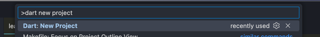 var height = 5.5; // height becomes double typeအပေါ်မှာ ပေးထားတဲ့ code တွေလိုက်ပြီး စမ်းချင်တယ်ဆို VS Code ထဲမှာ dart project တခုတည်ဆောက်ပြီး လိုက်လုပ်လို့ရပါတယ်။ Ctrl+Shift+P or Cmd+Shift+P ကိုနှိပ်လိုက်ရင် command palette ကို ဖွင့်လိုက်လို့ရပါတယ်။ comman palette ပွင့်လာပြီဆိုရင်တော့ dart new project လို့ ရိုက််ရှာလိုက်ရင် အောက်မှာ ပြထားသလို ထွက်လာပါလိမ့်မယ်။ တကယ်လို့ ထွက်မလာဘူးဆိုရင်တော့ extension တွေ မသွင်းရသေးလို့ ဖြစ်နိုင်ပါတယ်။ မနေ့က day 1 ရဲ့ VS Code setup လုပ်တဲ့အပိုင်းကို တချက်လောက် ပြန်ကြည့်ကြည့်လိုက်ပါ။