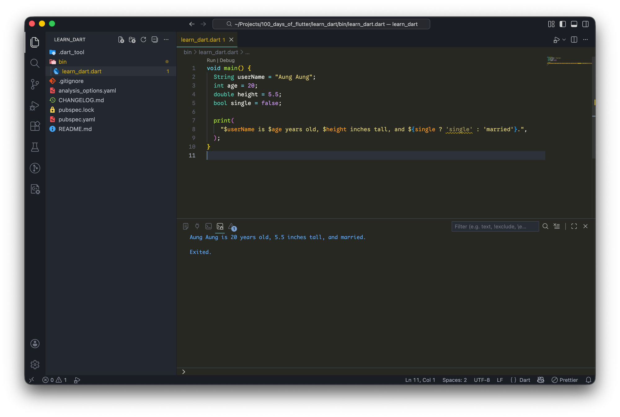 Project name ကတော့ ကြိုက်တာပေးလို့ရပါတယ်။ ကျွန်တော်ကတော့ learn_dart ဆိုပြီး ပေးလိုက်ပါတယ်။ Project ကို ဖွင့်ပြီးရင်တော့ bin/learn_dart.dart file ရဲ့ main function ထဲမှာ အပေါ်က code ကိုထည့်ပြီးတော့ void main() ရဲ့ အပေါ်က Run ဆိုတာကို နှိပ်လိုက်ရင် အောက်မှာ ပြထားသလိုမျိုး result ကို တွေ့ရမှာပဲ ဖြစ်ပါတယ်။