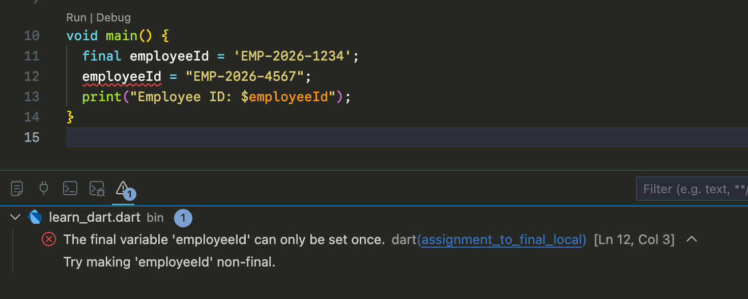 Program run နဲ့အချိန်မှာ တခါပဲ assign လုပ်ပြီး ပြန်ပြီး ပြောင်းလဲလို့မရအောင် လုပ်ချင်တဲ့အခါ final ကို သုံးပါတယ်။ ဒါကတော့ ဘာနဲ့တူလဲဆိုတော့ အလုပ်မှာ empoyee နံပါတ် သတ်မှတ်လိုက်တာနဲ့ တူပါတယ်။ နံပါတ်တခု သတ်မှတ်လိုက်တာနဲ့ အဲ့နံပါတ်က ပြောင်းလဲ ပြင်ဆင်လို့ မရတော့ပါဘူး။ ပြင်ဆင်ဖို့ ကြိုးစားရင် dart က ခွင့်ပြုမှာ မဟုတ်ပါဘူး။ အခုလိုမျိုး error ပြပေးနေမှာပဲ ဖြစ်ပါတယ်။