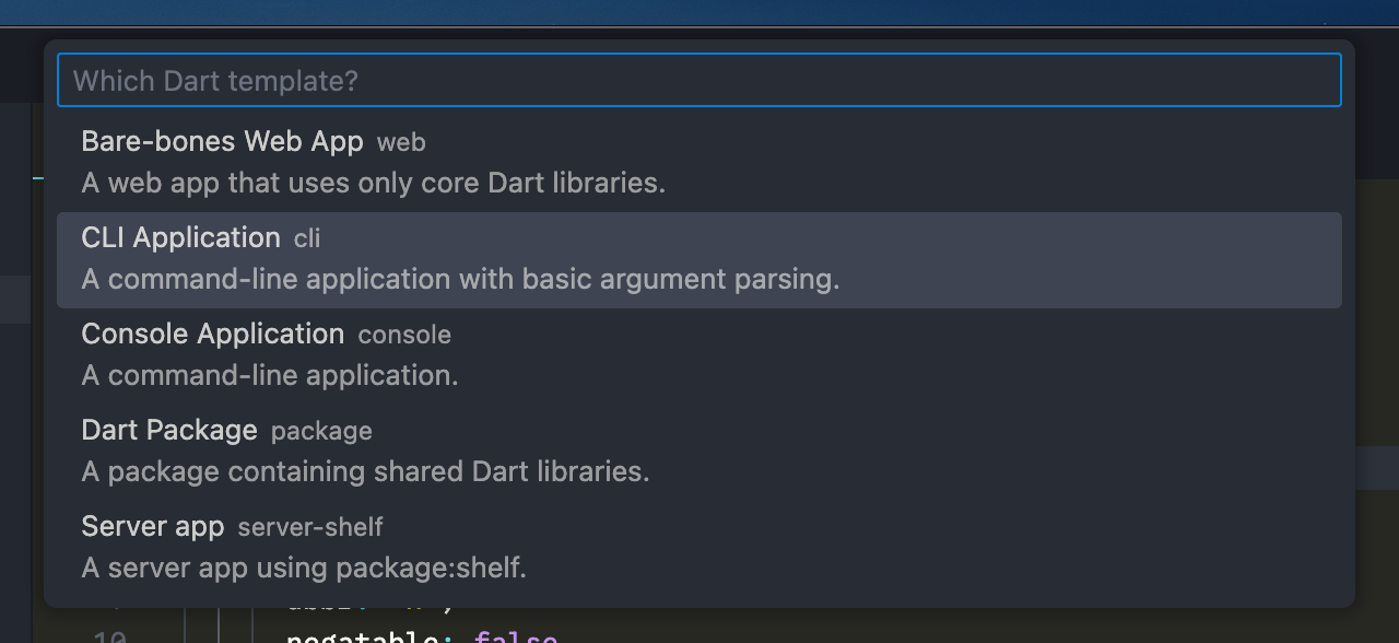 Dart: New Project ဆိုတဲ့ option ပေါ်လာတယ်ဆိုရင်တော့ နှိပ်ပြီးတော့ CLI Application တခု create လုပ်လိုက်ပါ။