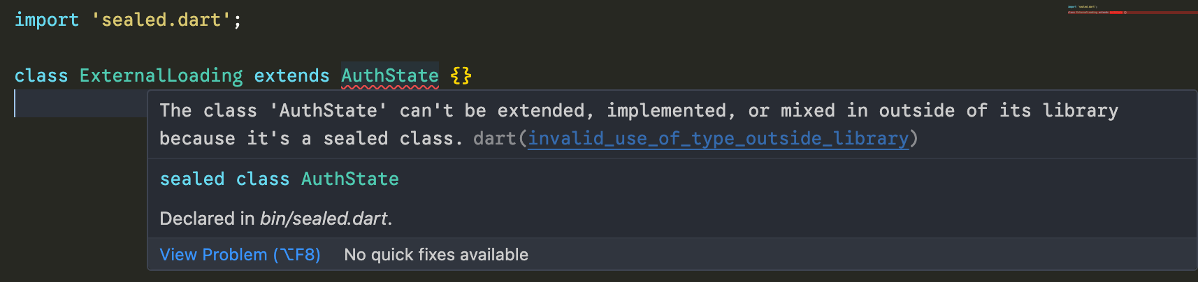 // Failed!ဒီမှာကြည့်မယ်ဆို switch အတွက် default အနေနဲ့ သတ်မှတ်ပေးဖို့ မလိုအပ်တော့ပါဘူး။ ရှေ့မှာတုန်းက _ => '???' ဆိုပြီး ရေးထားတာက sealed class သတ်မှတ်ပြီးတဲ့အခါမှာတော့ ဖယ်လိုက်လို့ရပါပြီ။ sealed နဲ့ ရေးလိုက်ခြင်းအားဖြင့် သူ့မှာ ဖြစ်နိုင်တဲ့ state တွေအားလုံးကို စုစည်းပေးလိုက်သလိုမျိုး ဖြစ်သွားပါတယ်။ ဒီလိုဖြစ်ဖို့အတွက် သူ့မှာ သတ်မှတ်ချက်တော့ ရှိပါတယ်။ sealed class ကို extends လုပ်တာတွေက သူနဲ့ file တခုထဲ, library တခုထဲအောက်မှာ ရှိနေဖို့လိုအပ်ပါတယ်။ ဒီတော့မှ compiler က ဖြစ်နိုင်တာတွေ အားလုံးကို သိပြီးတော့ တခုခုလွဲနေတယ်ဆိုရင် error အနေနဲ့ ထုတ်ပြနိုင်မှာပါ။